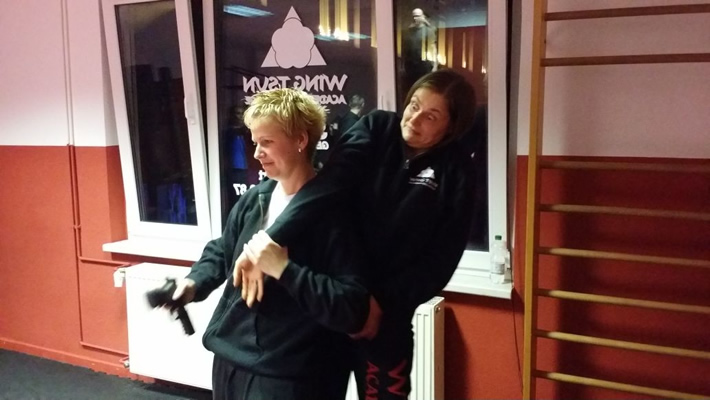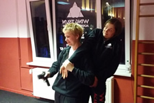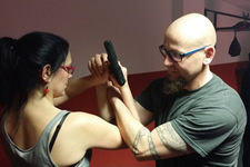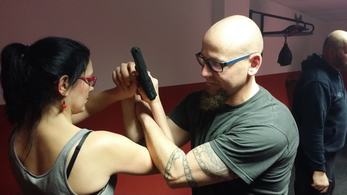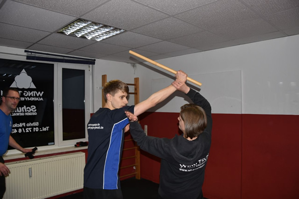 Ziel: Der Seminarteilnehmer beherrscht mindestens eine Technik zur Abwehr von Kurzhandfeuerwaffen. Die Techniken für Hieb- und Stichwaffen kann er selbständig durchführen.